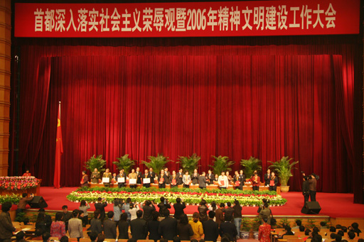 今天上午,首都深入落实社会主义荣辱观暨2006年精神文明建设工作大会在北京会议中心举行。 会上,市委书记刘淇、市长王歧山等领导为获得“首都精神文明建设奖”的先进单位和个人颁奖。我校晁无疾和徐...