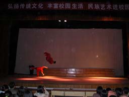 2005年4月28日晚,我校以“迎奥运,弘扬民族文化”为主题的奥林匹克教育节系列活动之中华武术功夫剧在大礼堂隆重上演。来自少林武术学校的学员们为我校的师生带来了惊心动魄、精彩绝伦的少林功夫、硬气功等表演。一系列的精彩表演向师生们展现出了我们中华武术功夫的精髓及民族文化的深厚底蕴,表演一次次赢得了在场师生的热烈掌声。
