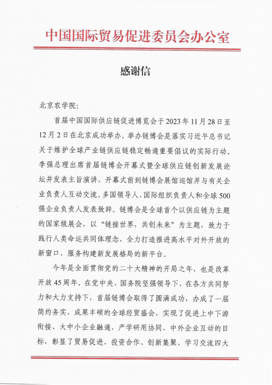 近日,中国国际贸易促进委员会办公室向学校发来感谢信,感谢学校选派的38名志愿者在中国国际展览中心顺义馆用青春和奉献提供的暖心服务。