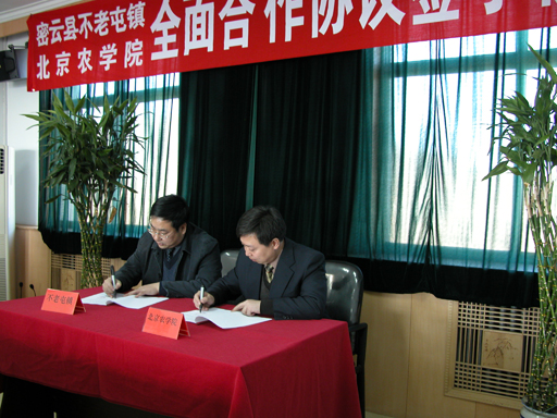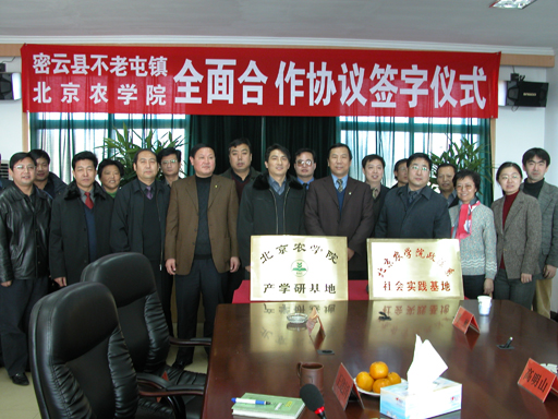 科研处张志勇处长代表我校与不老屯镇周广文镇长签署了《北京农学院与不老屯镇产学研基地建设合作协议》。副院长杜晓林与密云县副县长程文华为基地揭牌。紧接着,政法系华玉武主任和不老屯镇社会福利中心(国际敬老院)马主任签署了“北京农学院政法系校外社会实践基地共建合作协议书”,并与不老屯镇镇长周广先一起为实践基地揭牌。