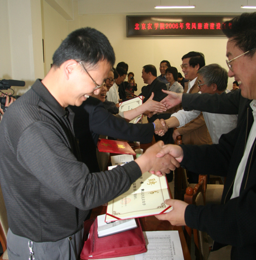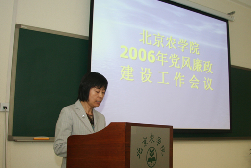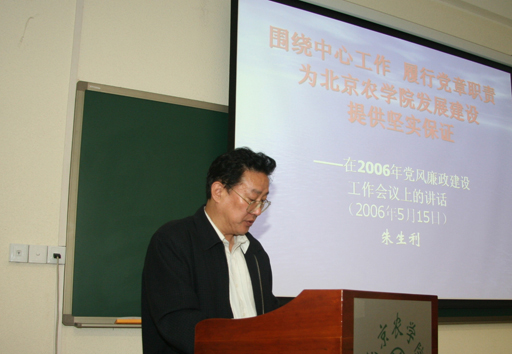 会上,纪委书记朱生利作“围绕中心工作,履行党章职责,为北京农学院发展建设提供坚实保证”的报告。他首先从加强教育,筑牢思想道德防线;健全制度,规范领导干部的从政行为;强化监督,促进权力运行的公开;加强监督,规范程序;履行组织协调职责,推动党风廉政建设责任制的贯彻落实;加强审计监督,促进规范管理五个方面总结了2005我校党风廉政建设和反腐败的工作情况。