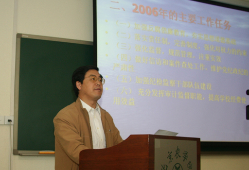 他还从加强反腐倡廉教育,夯实拒腐防变的思想道德基础;落实责任制,完善制度,强化对权力的约束;强化监督,规范管理,注重实效;做好信访和案件查处工作,维护党纪政纪的严肃性;加强纪检监察干部队伍建设;充分发挥审计监督职能,提高学校经费使用效益等六个方面部署了纪检监察审计部门2006年的主要工作任务。