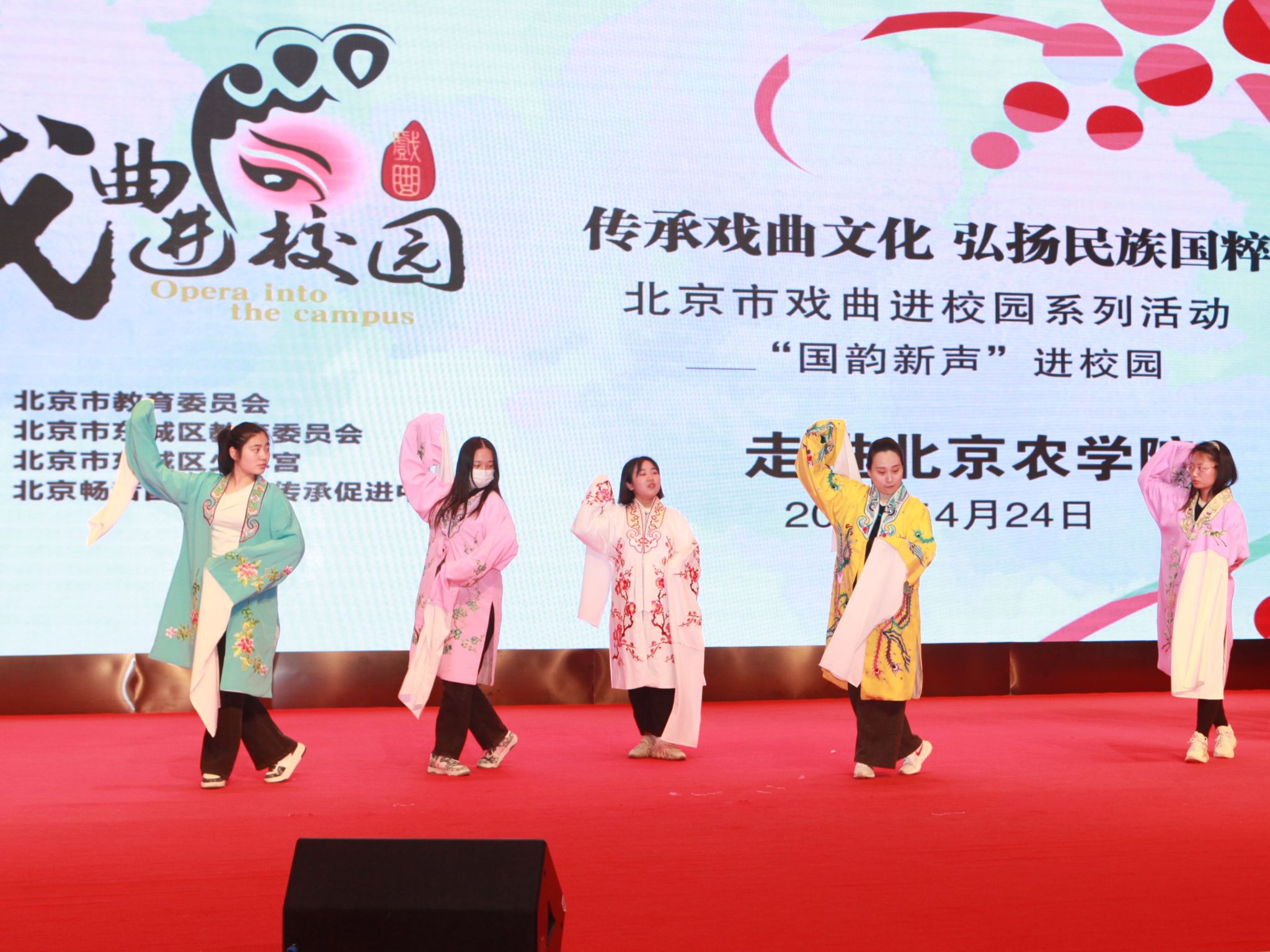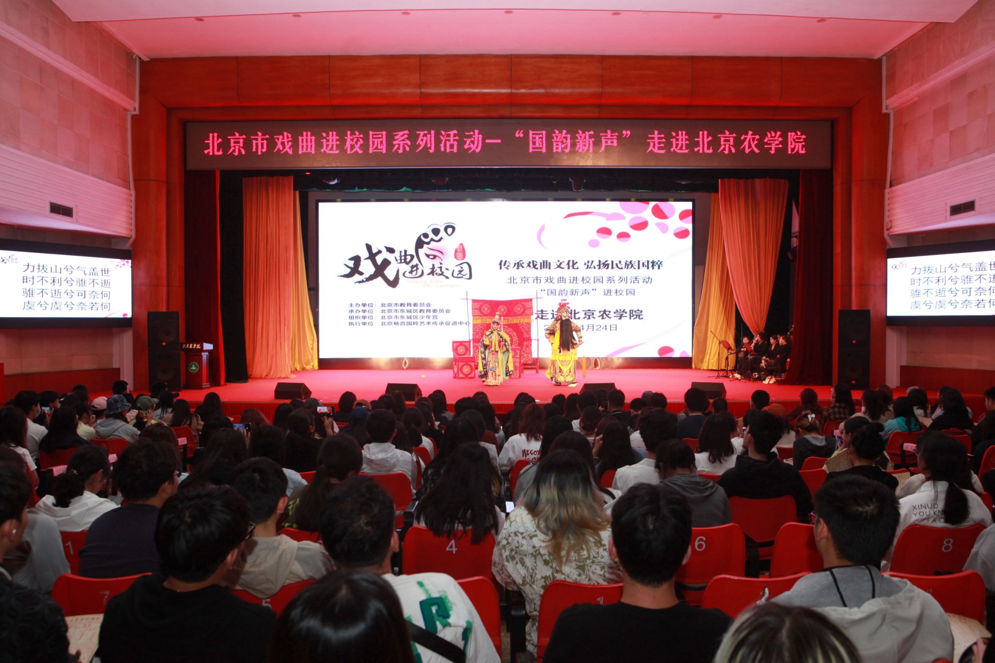 4月24日,北京市戏曲进校园系列活动之“国韵新声”走进北京农学院。我校师生代表以及来自北京化工大学、华北电力大学等高校的学生代表共600余人同赏国粹芳华,共享文化盛宴。