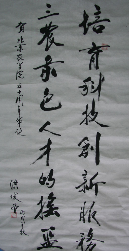 农业部原副部长洪绂曾为我校题词 恭贺我校五十华诞