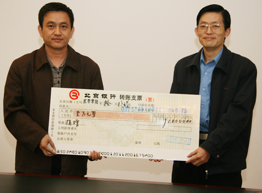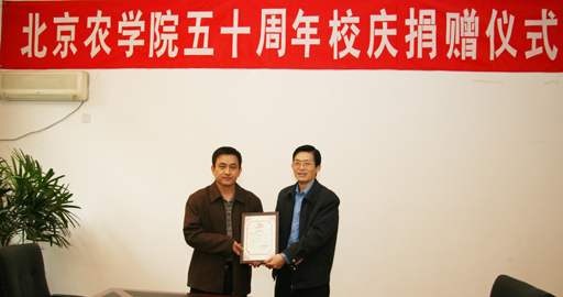 10月13日上午,北京市兽药饲料监察所向我校捐赠一万元,恭贺我校五十华诞。所长周德刚来校祝贺。动科系党总支书记张永红代表学校向捐赠单位颁发捐赠证书和礼品。副院长杜晓林、动科系副主任鲁琳、科研处副处长蒋林树及部分教师出席捐赠仪式。