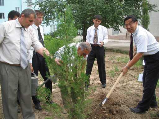 (杜院长一行在塔吉克斯坦国立农业大学校园内栽下友谊树)