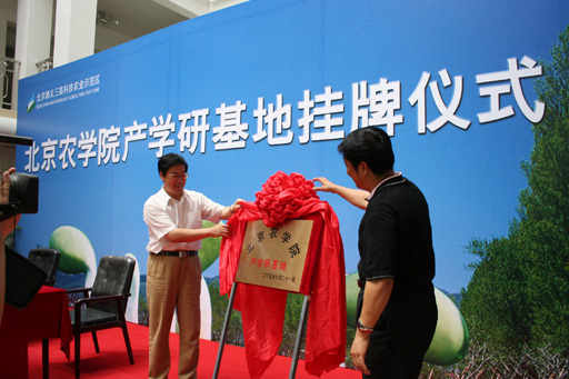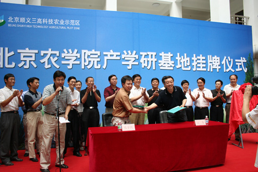 为了对农民进行科学技术培训, 提高农民科技素质,构建高效农业科技支撑体系,促使农业提质增效,同时为了将我校科技、人才资源优势转化为产业发展强势,大力实施科教兴农战略,在积极推进“221”行动计划、“涌泉”计划及全心全意服务“三农”的原则下,经过多次商谈,2005年7月2日,我校与顺义“三高”示范区就示范区内建立北京农学院产学研基地正式签署协议,并进行了挂牌仪式。