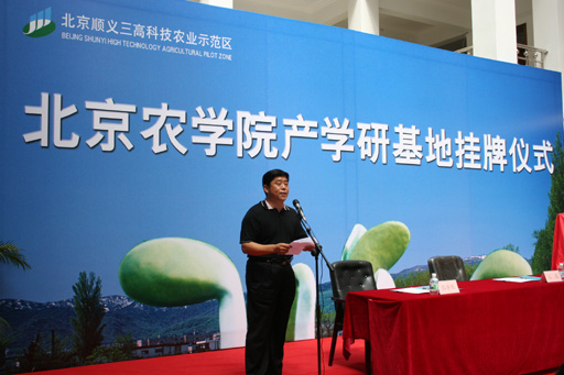 挂牌签字仪式由北京市农委王海龙副处长主持,顺义区副区长王振江、我院院长王有年、市科委处长张光连就我校与顺义区加强合作发表了热情洋溢的讲话,一致认为院区合作是推进“221”行动计划及“涌泉”行动计划的典范。学校科研处处长张志勇代表学校与顺义“三高”区赵主任签署了“北京农学院与顺义‘三高’产学研基地建设合作协议”。我院院长王有年与顺义区副区长王振江为基地揭牌。
