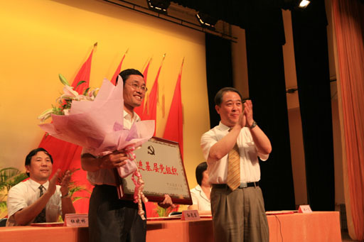 大会在高唱国际歌中开幕。党委书记孙尧东为荣获北京市优秀基层党组织植物科学技术系党总支颁发奖牌。