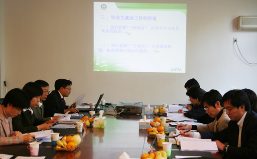 党委副书记王晓霞副首先代表学校对专家们的到来表示欢迎。会上,王书记从就业工作总体评价、就业工作自查情况、我校就业工作的经验以及存在的问题等几个方面全面、细致地向与会专家汇报了我校就业指导工作的情况。突出介绍了学校在就业导向上,通过紧抓“三种教育”、狠抓“三个到位”等措施大力弘扬毕业生到京郊基层就业的主旋律。
