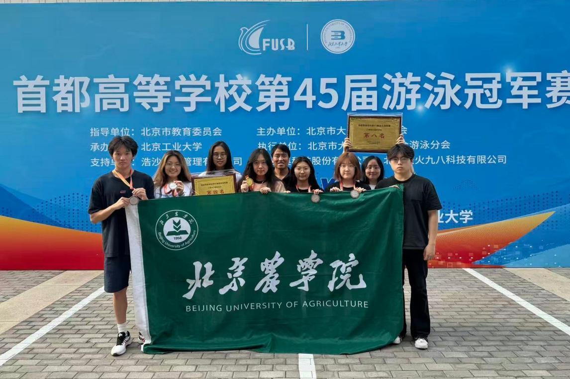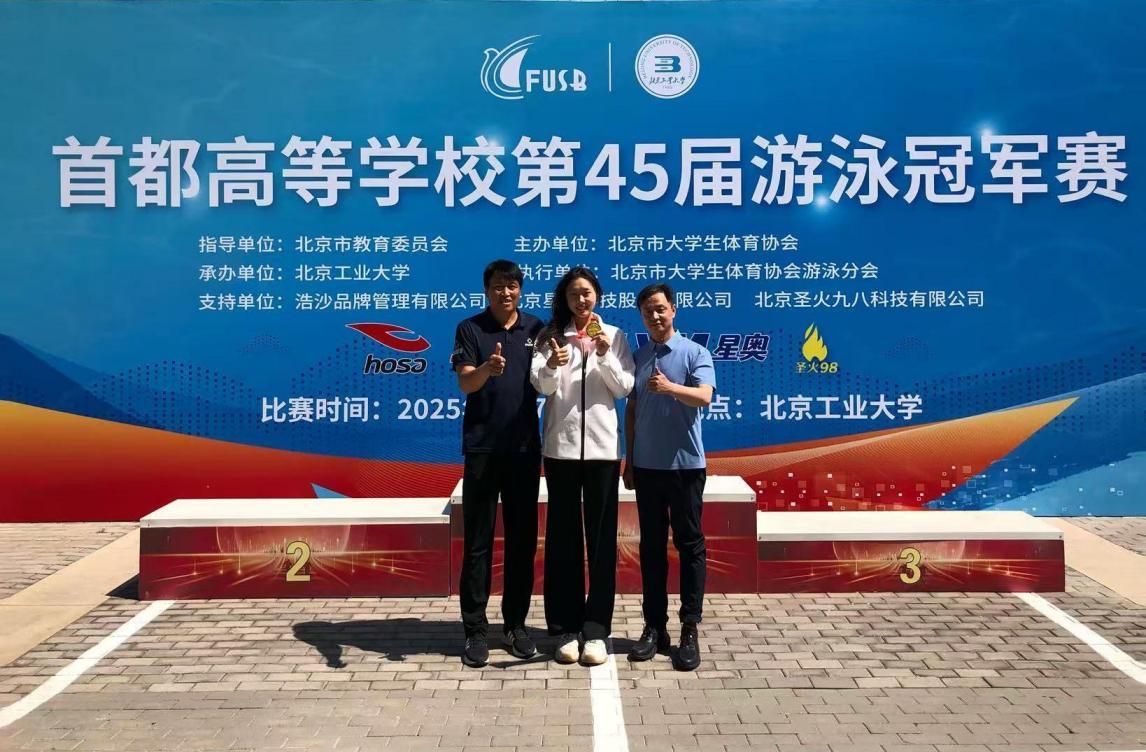 近日,由北京市教育委员会指导、北京市大学生体育协会主办的首都高等学校第45届游泳冠军赛在北京工业大学举行。来自北京大学、清华大学、北京体育大学等39所高校400余名运动员展开激烈角逐。我校游泳队在教练吴宝利老师带领下,斩获1枚金牌、4枚银牌,并取得乙组女子团体总分第四名、男女团体总分第八名的优异成绩。