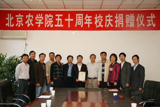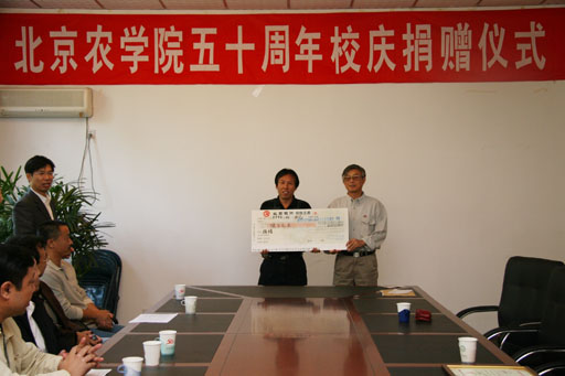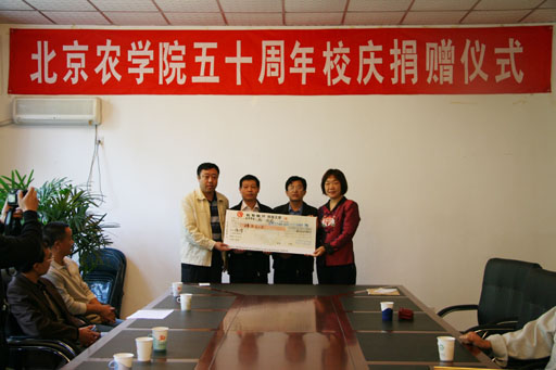 10 月12日 上午,我校校友昌平区百善镇党委书记李元和、昌平区沙河镇党委书记武子一、昌平区校友分会秘书长谢立武、北京青山园林艺术中心总经理隋士林、昌平区彩票销售站花海峰返回母校,向学校五十华诞贺喜。并代表昌平区校友分会向学校捐赠人民币10万元。