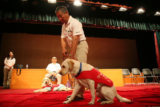 “导盲犬小Q”的父亲多和田悟先生作了题为“导盲犬的训练——为了放心的走路”的演讲,并请出两位导盲犬的使用者及他们所使用的导盲犬。导盲犬提示主人道路拐角、帮助主人上下台阶、带领主人穿越障碍物等出色表演让会场掌声不断,观众们排起长队纷纷要求与导盲犬合影,场内气氛达至高潮。