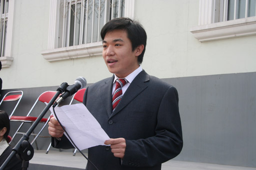 大运会红旗方队领队、经贸系学生会主席陈思同学作为志愿者代表在大会上发言,
