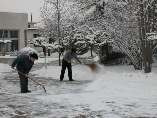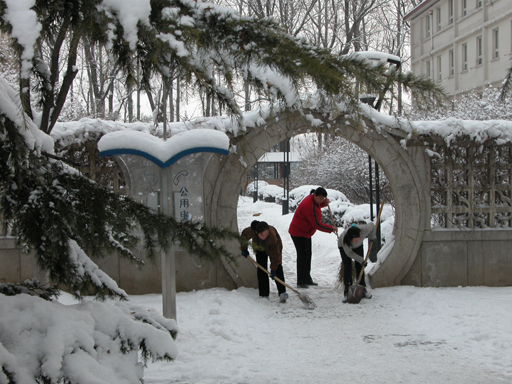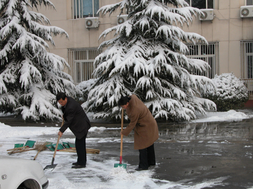 今天早上,学校各单位相关人员都在各自的扫雪责任区负责雪后路面清理工作,以保证广大师生正常的工作和学习。