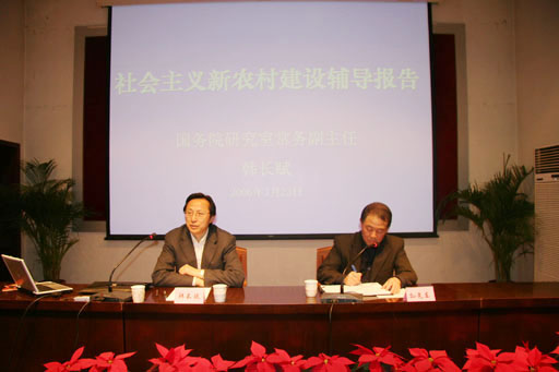 韩长赋同志详解了建设社会主义新农村的主要内容和基本原则,“生产发展、生活宽裕、乡风文明、村容整洁、管理民主”这二十个字是党在农村基层工作的具体体现,把握了这几个字就把握了三农工作的基本要求。他认为建设社会主义新农村的原则是:第一,要发展生产,坚持以经济建设为中心,发展农村生产力,这是基础;第二,必须落实好党的农村政策这是动力;第三,必须坚持城乡统筹,加大对农业、农村的支持力度这是方针;第四,必须尊重实际、尊重农民意愿,这是基础准则;第五,必须立足当前,着眼长远,长期艰苦奋斗。