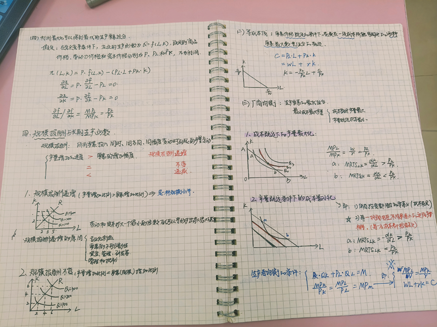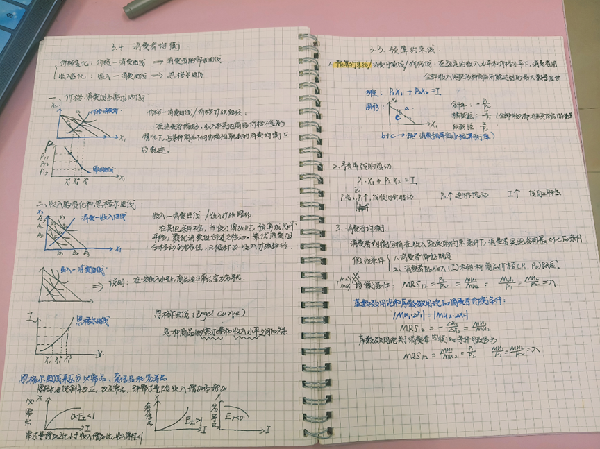 这是我微观经济学的笔记,我一般上课时会在书上做简单的记录,课下整合知识点并详细记录、画图、推导、整合,在记笔记的过程中加强理解与记忆,极大地提高了学习效率。
