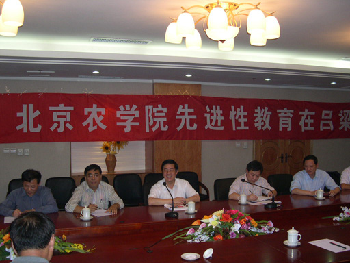 到达吕梁的,全体团员稍作休息后,随即召开了“北京农学院先进性教育活动在吕梁”座谈会,全体党员和非党员专家出席了座谈会。会上,院长王有年再次重申和明确了开展先进性教育与吕梁科技咨询有机结合的重要意义。与会人员结合专业和吕梁现状,热烈讨论了如何以实际行动在此次科技咨询活动中满腔热忱地实践共产党员先进性。大家认为,开展保持共产党员先进性教育活动,党员首先要了解和认识我国的国情,了解中国共产党在艰苦条件下为中国革命胜利做出的牺牲和贡献,尤其需要了解为中国革命做出积极贡献的革命老区,了解革命老区人民身上的不屈不挠、艰苦奋斗的精神。科技扶贫团临时党支部听取了大家的意见。提议党员在进行科技咨询的同时,要就近进行先进性教育,深刻理解“三个代表”重要思想。