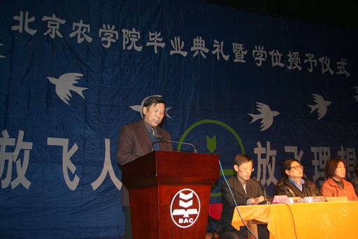 党委副书记王晓霞代表校党政领导致辞。她首先向2006届春季毕业生圆满完成学业表示热烈祝贺并向为我校教育事业辛勤耕耘、无私奉献的广大教师致以深深的感谢和敬意!王晓霞同志在致辞中充分肯定了广大毕业生同学们在学校发展与建设中所起的积极作用。她还特别提到了学校在近年来,紧紧抓住历史发展的机遇,在人才培养、学科建设、校园基本建设等方面都取得了重大进展,学校总体办学实力和水平显著提高。