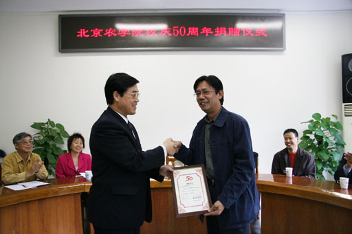 院长王有年代表学校向北京金海琪景绿化工程公司颁发捐赠证书并赠送礼品。
