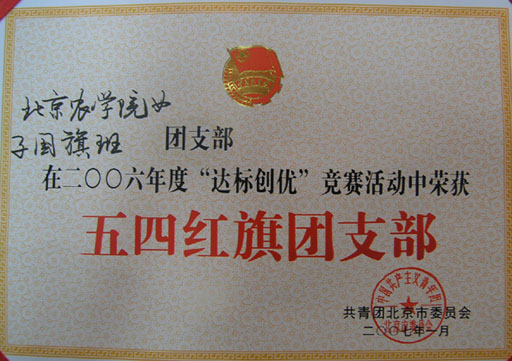 北京共青团“达标创优”竞赛活动是由团市委、市人事局组织开展的全市共青团系统最高级别的综合类竞赛活动,竞赛活动所设置的奖项均为北京市共青团系统的最高级别综合性奖励。团市委、市人事局在2006年度北京共青团“达标创优”竞赛活动评比中,授予我校团委2006年度北京共青团“达标创优”竞赛活动组织奖,授予我校国旗班团支部2006年度北京市五四红旗团支部荣誉称号。