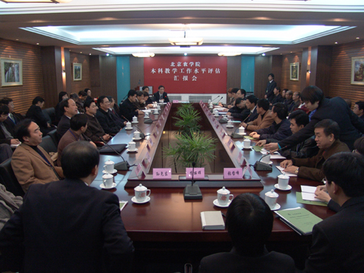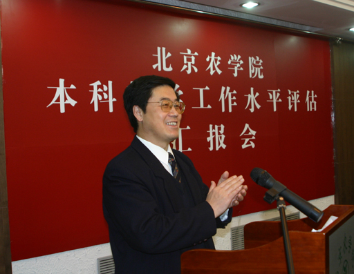 院长王有年从五个方面汇报了我校本科教学工作水平的工作和教学评建工作情况:学校伴随北京郊区现代化发展不断壮大;坚持正确的办学方向,明确学校发展道路;切实加强管理,不断提高本科教学水平;不断提高科研水平,服务首都郊区现代化,凝练学校办学特色;加快跨越式发展,办好让人民满意的高等教育。最后,王院长谈到,经过几代人的不懈努力,无私奉献,北京农学院已经发展成为一所具有一定规模和办学实力的高等农林学校。但是与党和政府的要求、社会和家长的期盼以及与兄弟院校比起来还有不少差距。我们将以此次评估为契机,在教育部和市委、市政府的领导下,把本科教学工作做得更好,把北京农学院办得更好。