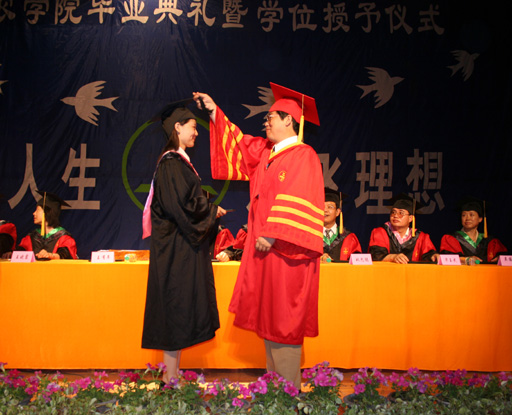 毕业典礼结束后,举行了学士学位授予仪式,王有年校长首先为获得学士学位的学生代表经贸系毕业生张爽授予学位证书并挑理流苏,随后,学校的校系领导依次为获得学士学位的同学授予了学位证书并挑理流苏。仪式结束后,毕业生与校系领导合影留念。