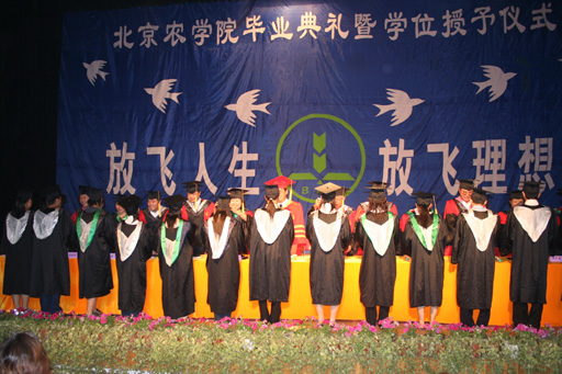 6月24日上午9点,北京农学院2005届秋季毕业典礼暨学士学位授予仪式在学校礼堂举行。校长王有年、校领导罗维忠、王晓霞、王伟、郑一淳、姚允聪及教务处、学生处、团委、各系的领导出席典礼。学生处处长孙亚利主持仪式。
