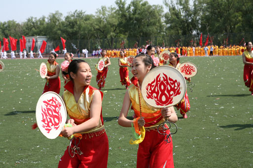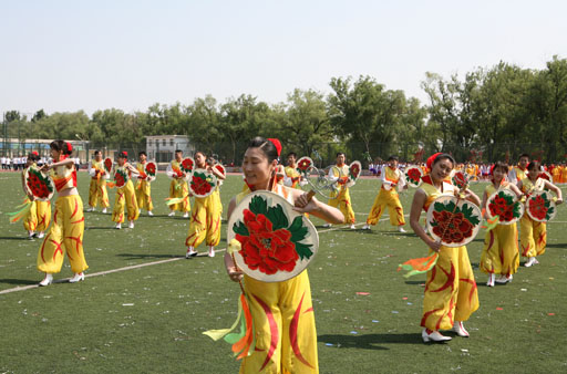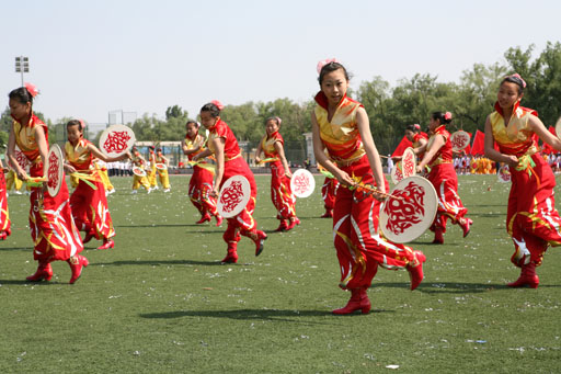 5月21日上午8:53在我校体育场上鼓声隆隆,一片举校同庆的欢悦。这是来自与我校有着良好合作关系的门头沟区特别线上的被列为国家非物质文化遗产保护项目和2008年北京奥运会开幕式表演备选项目的太平鼓表演。他们用欢快的节奏明快的鼓点祈祝着我们在新农村建设中谱写新篇,祝贺着本届运动会的胜利召开!