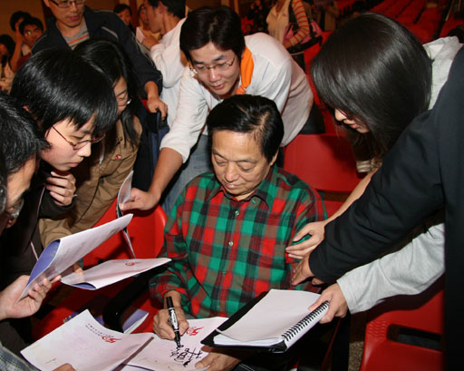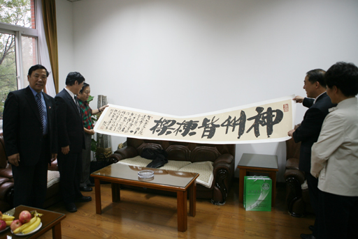 韩美林先生向我校赠送他亲笔书写的“神州皆栋梁”贺词,同时还向我校赠送了他创作的生肖浮雕——黄犬有情。韩美林先生还在党委书记孙尧东、院长王有年的陪同下观看了我校建校五十周年文艺晚会。