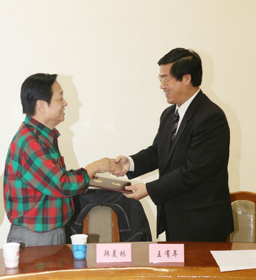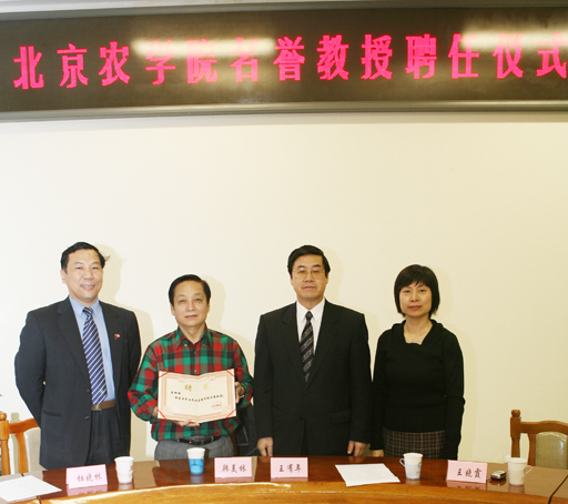 10月13日下午,美术大师韩美林先生被聘为我校园林系名誉教授,院长王有年为韩美林颁发证书。