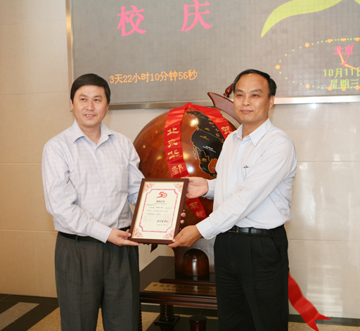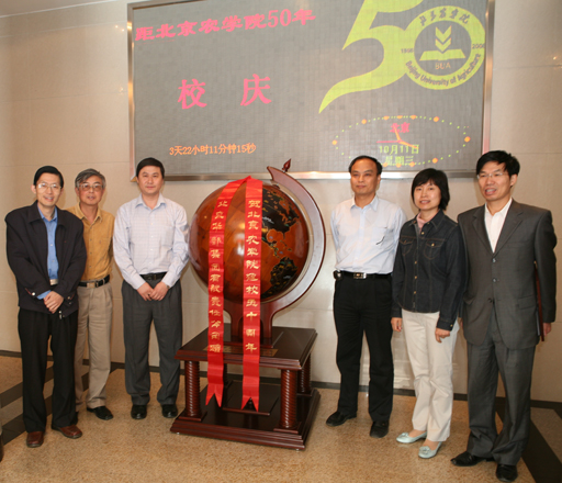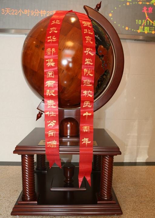 10月11日上午,北京华都肉鸡公司党委书记、常务副总经理张立军,北京爱拔益加家禽育种有限公司董事长孙家发代表北京华都集团有限公司来校祝贺我校五十华诞,并向我校捐赠一木制地球仪,以祝愿我校面向未来,走向世界。地球仪摆放在办公楼大厅中间。