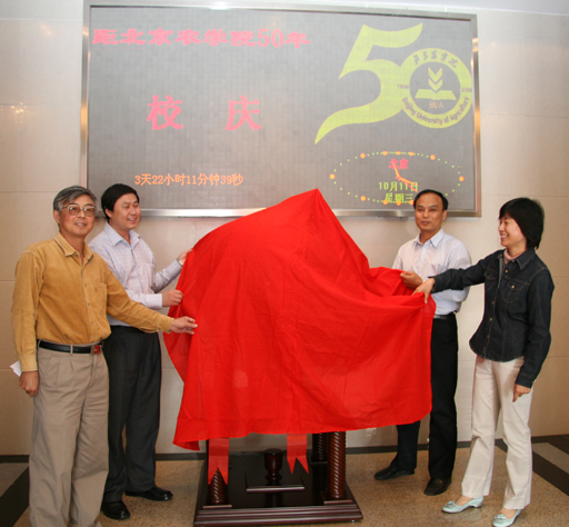 北京华都肉鸡公司党委书记、常务副总经理张立军,北京爱拔益加家禽育种有限公司董事长孙家发与我校党委副书记罗维忠、王晓霞共同为地球仪揭幕。