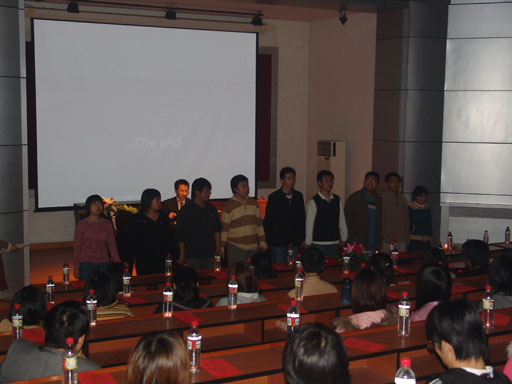 在“感动塔镇”的主题中,学生党员洪士寓对社会实践期间所遇到的人、所经历的事、所获得的感受以及所学到的知识做了的小结;在“深入塔镇,专业所学的充分发挥”主题中,赵忠才同学对社会实践小分队在塔镇所做的专业调查、专业知识的发挥做了大致介绍;赵斌斌同学从捐赠仪式,课余生活,与领导座谈三方面对在塔镇的社会工作向大家作了题为“实践之行,丰富多彩的社会活动”的介绍;在“塔温敖宝,遭遇爱的震撼”主题中,小分队的两位成员又通过特殊的形式向大家展示了整个赴内蒙实践小分队是如何被“爱”所包围的。