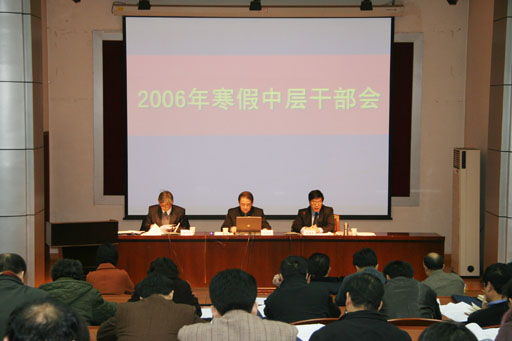 2006年2月15日上午在图书馆学术报告厅,学校召开2006年寒假中层干部会。全体校领导、中层干部、学术带头人以及教学督导组成员参加了会议。会议由党委副书记罗维忠主持。