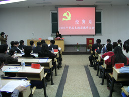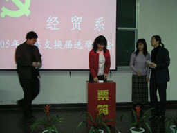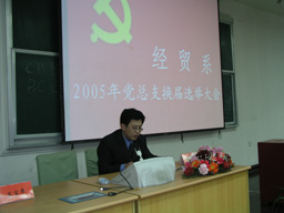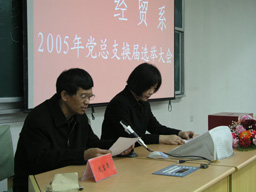 2005年4月6日下午4:00,经贸系党总支换届选举党员大会在新实验楼阶一教室隆重召开,大会由经贸系主任陈跃雪主持。校党委副书记王晓霞、组织部部长张铁强、食品系党总支书记贾昌喜、离退休党总支书记曲清茂出席了大会。