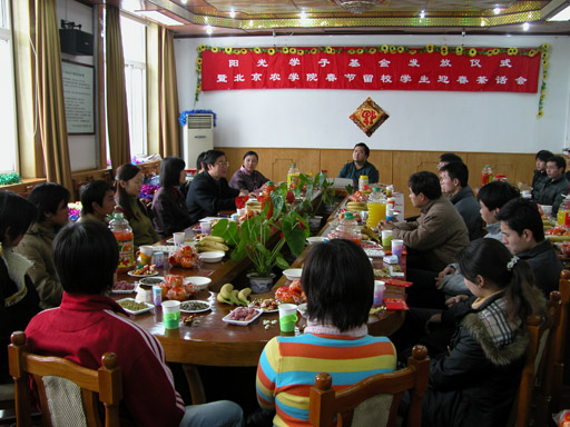 2005年2月7日上午,北京农学院阳光学子基金发放仪式暨春节留校学生迎新春茶话会在第三会议室隆重举行。院长王有年、党委副书记王晓霞、党委学生工作部部长、学生处处长孙亚利、院团委书记赵洪娥出席了发放仪式和茶话会。我校28名春节留校学生参加了发放仪式和茶话会。发放仪式和茶话会由党委学生工作部部长、学生处处长孙亚利主持。