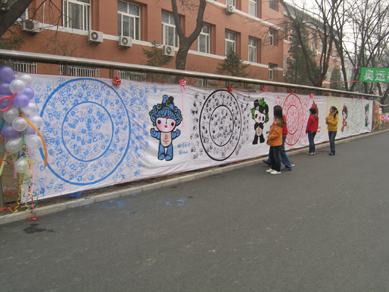 的画布上,蓝、黑、红、黄、绿五环和奥运吉祥物贝贝、京京、欢欢、迎迎、妮妮依次相间排列,同学们纷纷在五环幕布上印下自己手印,表达对奥运会成功举办的企盼与祝愿。这是我校学生会在庆祝奥运会倒计时500天之际举办的“手印五环,志愿奥运”活动。