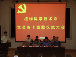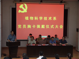组织部部长张铁强、宣传部部长程春生、学生工作部部长孙亚利、植科系党总支书记潘金豹,为植科系各党支部代表佩带了党员胸卡,并向各党支部发放了《植物科学技术系学生党员工作手册》,系党总支宣传委员秦岭及组织委员陈学珍分别宣读了“植科系党员佩戴胸卡管理办法”和 “植科系教工党支部与学生党支部建立 ‘一对一联系制度’的办法”。植科系党总支书记潘金豹在讲话中强调,