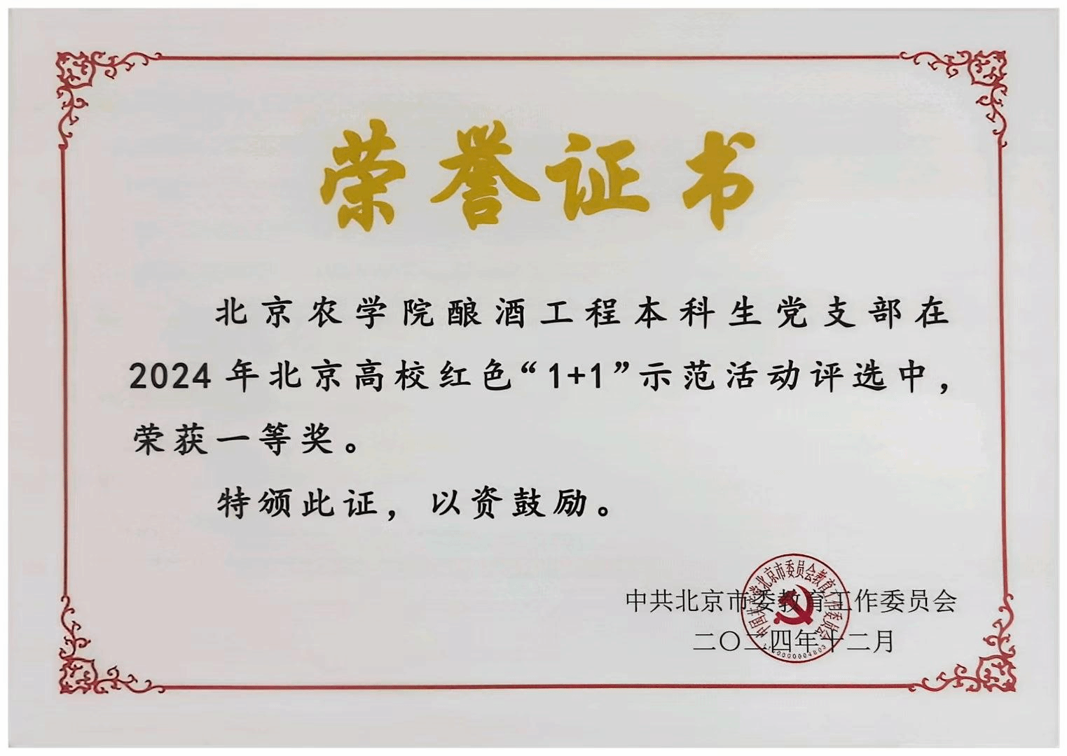 近日,由中共北京市委教育工作委员会主办的2024年北京高校红色“1+1”示范活动展示交流评选结果揭晓,我校食品科学与工程学院酿酒工程本科生党支部进行现场展示并荣获一等奖。