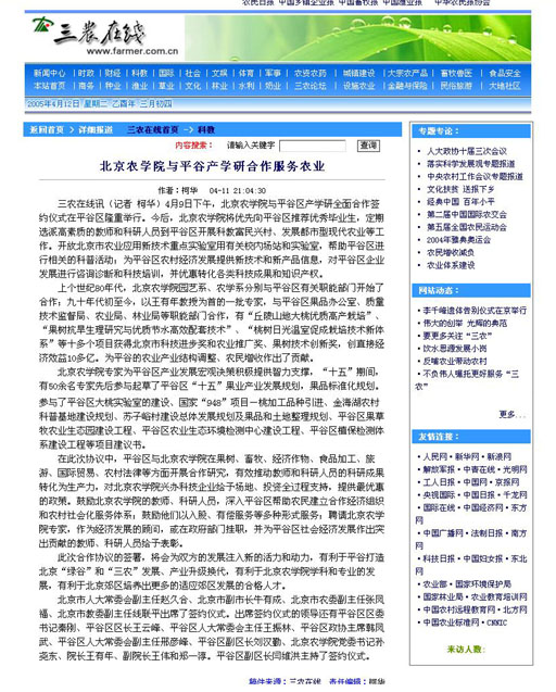 [三农在线]发表文章:北京农学院与平谷产学研合作服务农业