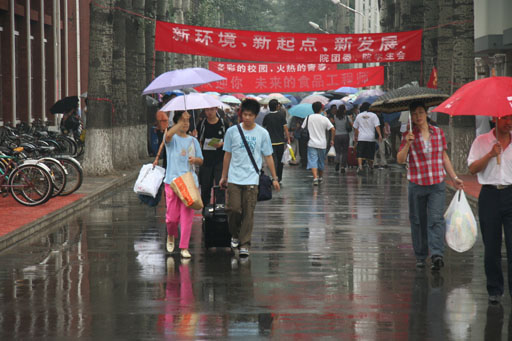 8月30日,我校迎来1880名新同学。六点不到,各系(二级学院)接待点的迎新工作人员全部到位,咨询处、路线指示牌,随处可见。六点半左右,原本的毛毛细雨越变越大,给迎新工作带来了很多不便,有些家长和新生没有带伞,都被淋湿了。各系及时调集雨伞,发给未带雨伞的新生家长,体现出我校对新生的关心和爱护。我校学生处在新生报到点,专门开辟了绿色通道,以方便贫困学生及时办理贷款事宜。