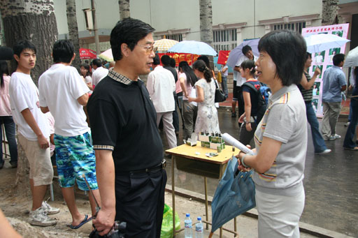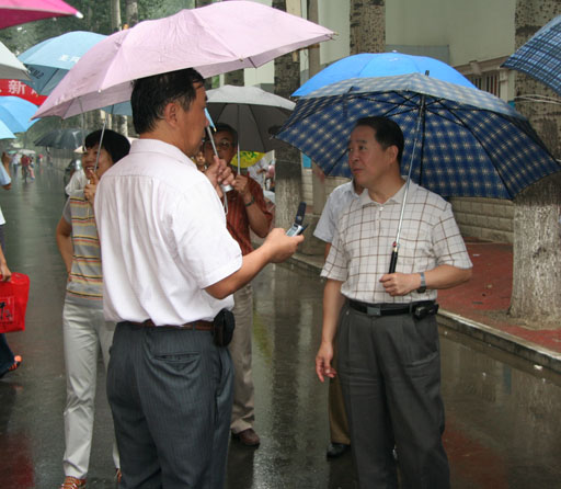 八点不到,党委书记孙尧东、院长王有年、党委副书记罗维忠、王晓霞、副院长杜晓林、纪委书记朱生利亲临报到点现场,在雨中慰问迎新工作人员,了解新生报到情况。