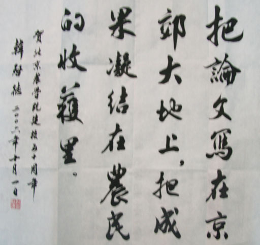 10月1日,全国人大常委会副委员长、九三学社中央主席、中国科协主席韩启德欣然为我校建校50周年题词:“把论文写在京郊大地上,把成果凝结在农民的收获里。”