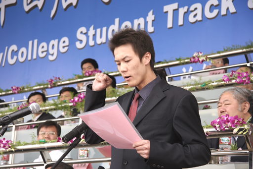5月21日上午8:49我校吴涛代表全体运动员宣誓,保证在比赛中胜不骄,败不馁,尊重裁判,尊重对方,尊重观众,奋力进取,顽强拼搏,赛出风格,赛出水平,反映出当代大学生运动员的精神风貌。