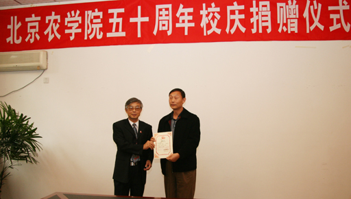 10月13日下午,北京市华都峪口禽业有限责任公司向我校捐赠三万元人民币,以祝贺我校五十华诞。北京市华都峪口禽业有限责任公司副总经理周宝贵来校祝贺。党委副书记罗维忠代表学校向捐赠单位代表颁发捐赠证书和礼品。动科系党总支书记张永红、动科系副主任鲁琳及部分教师出席捐赠仪式。