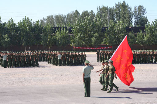 与会的全体师生及教官在雄壮的中国人民解放军军歌声中迎来了北京农学院军训团团旗。
