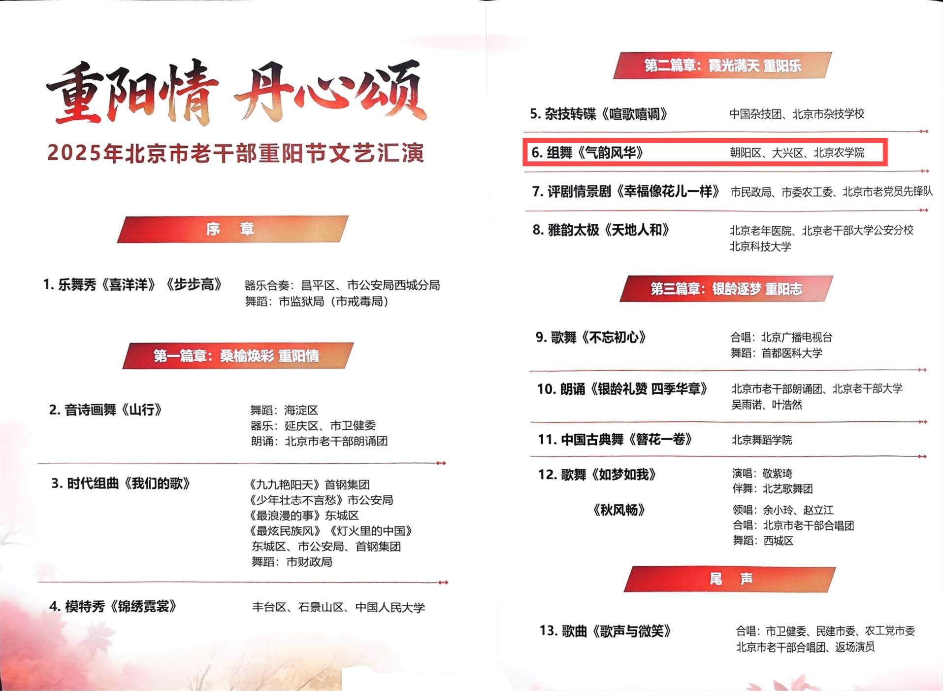 近日,“重阳情 丹心颂”2025年北京市老干部重阳节文艺汇演在北京广播电视台大剧院举行。市委副书记游钧出席并致辞,向全市老同志致以节日问候。我校由离退休教职工组成的“青之荷”舞蹈队,与朝阳区、大兴区的老同志们共同参演了组舞《气韵风华》。