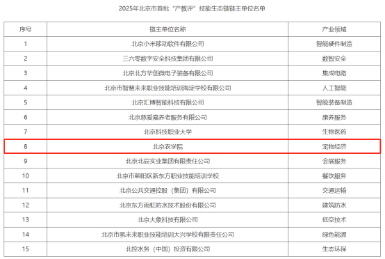 近日,北京市人力资源和社会保障局公示首批“产教评”技能生态链建设试点单位名单,北京农学院作为链主单位成功入选,成为本轮试点中以高校为牵头单位的代表之一。项目聚焦“伴侣动物健康与护理”方向,由校办产业处(国家大学科技园)牵头申报,与动物科学技术学院(动物医学院)联合承担策划与建设工作。