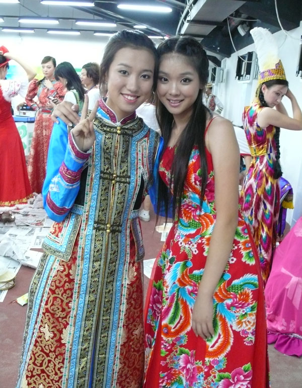 (左为娜莎,图为娜莎在开幕式前化妆间与同伴合影)